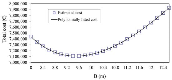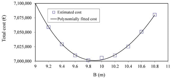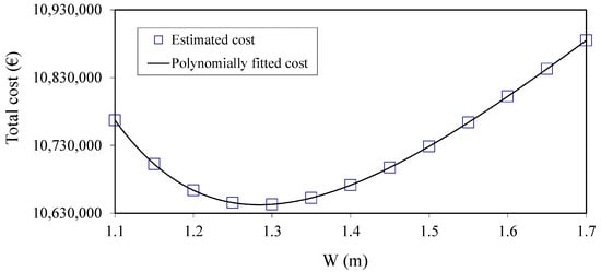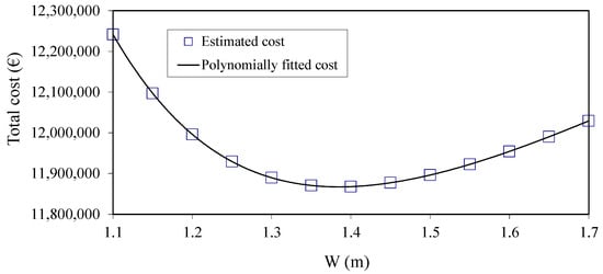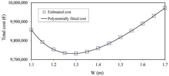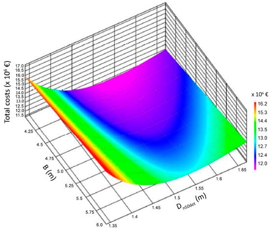 Future marine climate conditions are generally expected to increase the probability of failure of coastal, port, or harbor structures. For the structures that shall not be able to meet their future requirements, an upgrading method should be suggested and applied. The construction of a crown wall or parapet or strengthening and heightening of an existing superstructure (mitigation option 1) is expected to have no prominent effects on the global stability of the breakwater considered. Nevertheless, it is expected to increase the hydraulic performance of the structure by reducing overtopping and to indirectly contribute to the structure’s stability by minimizing hydraulic loads and impact of wave forces on the structure []. The addition of a new seaside armor layer (mitigation option 2) is expected to have a mild effect on global stability of the structure [], while overtopping will decrease due to possible elevation of existing crest elements. A berm structure (mitigation option 3) protects the breakwater toe against scouring and also increases the hydraulic performance of the structure by reducing overtopping []. Finally, a detached low-crested structure in the seaward front of the existing breakwater (mitigation option 4) assists in the transformation of the incident wave characteristics that impact the breakwater, inducing lower significant wave heights and peak spectral periods due to breaking, bottom friction, and percolation, and therefore increases both the stability of the main structure and also its defense against overtopping []. For each aforementioned mitigation option a large number of possible alternative geometries are implemented and failure probabilities are calculated using the fault tree of Figure 3.