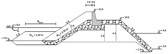 Constructing a berm on the windward side of the studied breakwater (mitigation option 3; Figure 2c), a significant effect is generally expected on the global stability and the overtopping discharge of the rubble mound breakwater. The primary armor layer of the breakwater should suffer reduced damage due to the transmission of decreased wave height on the berm crest. The reliability function for primary armor layer stability, Z31, becomes: