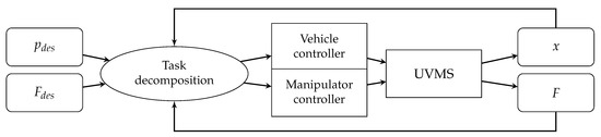 The main focus of this work is on the control of lightweight vehicle-manipulator systems where the effects of the manipulator movement on the vehicle behaviour is significant as it was previously demonstrated in [21]. These interaction effects are considered as disturbances in the decoupled strategy and a reliable and good vehicle controller has to be employed to solve this challenge. In this case a separate controller is designed for the vehicle and another controller is needed for the manipulator. A separate task has to be defined for each part of the system at every time step. This leads to integrating a high-level component that decomposes the main task in separate tasks for the vehicle and the manipulator. A schematic representation of the overall strategy is presented in Figure 2.