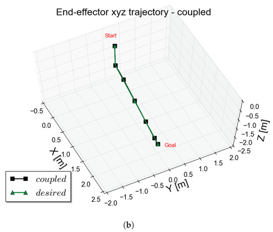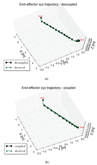 End-effector 3D position, goal at m. (a) Decoupled strategy, (b) Coupled strategy.
