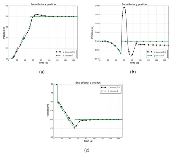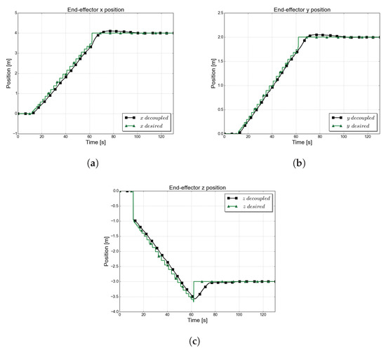 Decoupled strategy UVMS end-effector position tracking, goal at m and N/m. (a) x-position decoupled, (b) y-position decoupled, (c) z-position decoupled.
