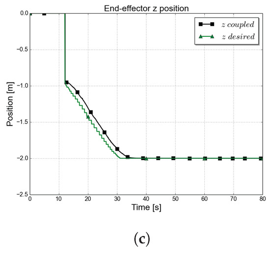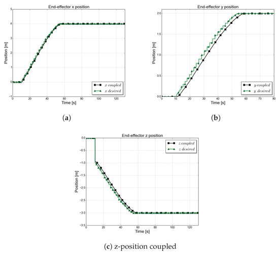 Coupled strategy UVMS end-effector position tracking, goal at m and N/m. (a) x-position coupled, (b) y-position coupled, (c) z-position coupled.