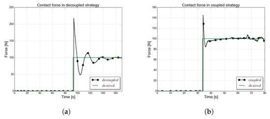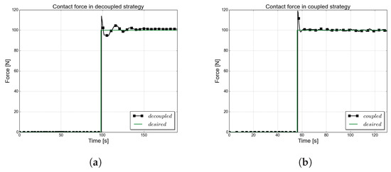 The desired force is achieved and maintained using both strategies. Small oscillations can be visible in the decoupled approach. For the coupled case an initial larger overshoot is observed but smaller oscillations are seen in Figure 8b. At the moment when contact with the environment takes place, the manipulator compensates for the force and is trying not to lose position while maintaining contact. This will drive the manipulator to apply a larger force that results in an overshoot.