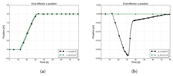 Figure 13 shows also the behaviour of the joints when the coupled strategy is used. It can be observed that this shows a more restrictive movement of the arm. The joint movements presented in Figure 13 lead to the end-effector error presented in Figure 14. It can be seen that the end-effector is locked and a constant x-axis error is present for the simulation time. In this case, the exact location of the goal is not reached and the manipulator is not in contact with the object with no force being requested to the end-effector.