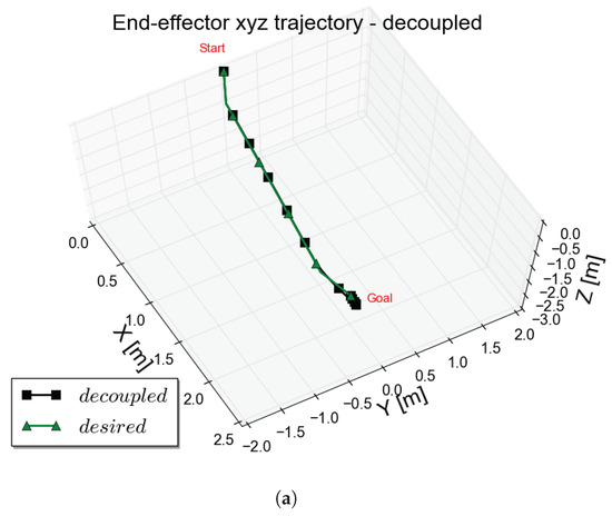 In this case the final goal is m and the desired interaction force is N. The end-effector trajectory tracking is presented in Figure 5. The desired trajectory starting point is m in world coordinates that represents the point where the manipulator is attached to the vehicle. Starting at this point, the end-effector is commanded to move towards the goal. The decoupled and coupled strategy behaviour can be observed based on the 3D trajectory of the end-effector.