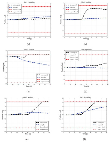 Figure 13 presents the behaviour of the joint positions. The physical minimum and maximum limits of the joints are also presented. It was shown in the previous section that this goal, m, is reachable. In this case it is intended to demonstrate that setting the threshold to half of the manipulator’s length does not lead to the desired behaviour. Furthermore, it is aimed to show that the strategy is sensitive and highly dependent on the threshold used for the task decomposition. Three out of six joints reach their limits, Figure 13c,e,f and this prevents the end-effector reaching the final goal. The direct connection between the threshold and the success of the task represents a disadvantage of the decoupled approach. Nonetheless, this represents only a naive strategy to decide which subsystem is in station keeping. If a planning strategy such as an optimal trajectory generation approach would be used instead of the cycloid function for waypoints generation improvements in the the system response are expected. Using the dynamic model of the system in the optimal trajectory generation, suitable trajectories can be generated for both vehicle and manipulator, taking into account the interactions between the two subsystems. A detailed description of this type of optimal trajectory generator for UVMS is presented in [31]. Nevertheless, this is out of the scope of this paper and represents a topic of itself that the authors aim to explore in a future paper.