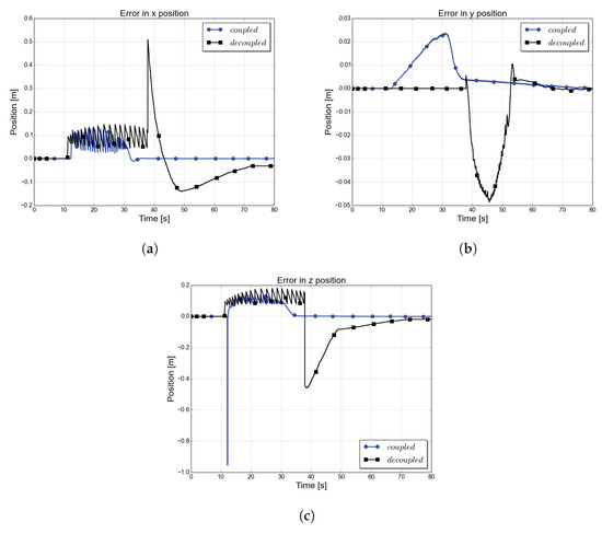 Coupled strategy UVMS end-effector position tracking for goal at m. (a) x-position coupled, (b) y-position coupled, (c) z-position coupled.