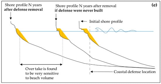Illustration of the development and loss of a step in the shore platform profile due to the construction and removal of a vertical coast protection. Beach volume is represented as a yellow polygon and shore platform profile as a black solid line. The panels show an idealized beach and shore platform evolution; (a) initial beach and shore platform profile at the time of construction of the coastal defence; (b) after the construction of the defence, shore platform lowering (red arrows) seaward of the defence is larger than behind, and so a step develops; (c) when the defence is removed, the (steepened) shore platform previously behind the step is exposed to higher wave energy, inducing rapid shore platform and cliff retreat (the shore platform in front of the structure continues to erode at a low rate); (d) after a period of time the step is removed and a new quasi-equilibrium coupled beach and shore platform profile is reached; retreat rates then reduce and become more steady; (e) sensitivity analysis has shown that the ‘overtake’ (i.e., excess net shoreline retreat caused by this process) increases if beach volume decreases.