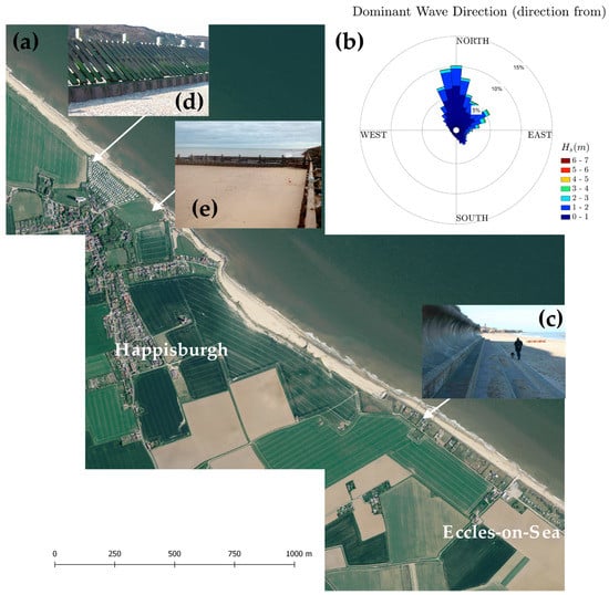 Study site: (a) aerial view of the study region in 2010 showing the embayment (source EA, year 2010); (b) wave rose for Happisburgh created using downscaled data (1961–2016) from the UKCP09; (c) detail of the sea-wall protecting the low-lying coast of Eccles-on-Sea; (d) view of the wood revetment and sheet pile that is still in place northwest of Happisburgh (source Mike Walkden, year 2013); (e) detail of wooden groin used to slow down the alongshore sediment transport (source Andres Payo, 2017).