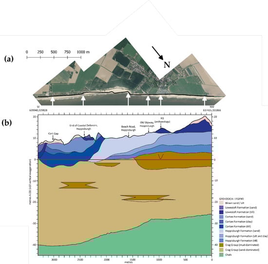 The cliffs at the study site range in height from 6 to 20 m above Ordnance Datum (OD). They are composed of a sequence dominated by glacigenic sediments including multiple diamictons (admixtures of poorly-sorted clay, sand and gravel), separated by beds of stratified silt, clay and sand (Figure 4) [13,14,15]. These units were deposited during several major incursions of glacier ice into the region during the Middle Pleistocene [16]. The basal unit that discontinuously outcrops at the base of cliffs is the Crag Group (Early to early Middle Pleistocene age), which is typically obscured by modern beach material but is periodically exposed following storms [11]. The Crag Group consists of stratified sands and clays interpreted as shallow marine to inter-tidal in origin andvpunctuated by occasional elongate lens-shaped bodies of fluvial muds [17,18]. The Crag Group rests unconformably on an undulating upper surface of cchalk bedrock (Cretaceous age). chalk bedrock depths increases from about −25 mOD at the northern end to −40 mOD at the southern end. The large potential stock of sand and gravel at the shore platform associated with the Crag Group suggest that the beaches at Happisburgh might not be sediment starved, providing that the wave and currents have enough energy to erode and transport this material towards the coast.