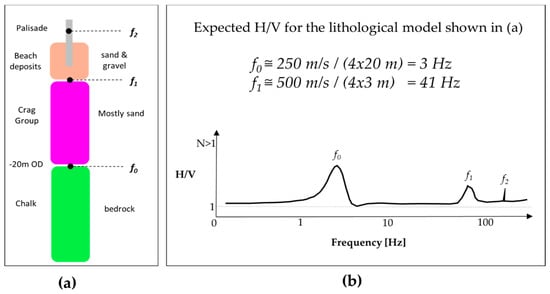 where the value of Vs varies for different materials with typical values of: 100–180 m/s for clay, 180–250 m/s for sand and 250–500 m/s for gravel. In case of several peaks on the H/V curve, the peak with the lowest frequency is the fundamental mode (f0, generally the bedrock-cover limit) and other peaks (i.e., f1, f2, …, fn) correspond to other geological limits which also cause seismic motion amplification. For the stations located on the beach at the study site we would expect to see one peak corresponding with the interfaces between the Crag Group and the chalk (f0), one peak at the interface between the contemporaneous beach deposits and the Crag Group (f1) and one non-lithological peak corresponding to the presence of the sheet pile (Figure 5). The estimated frequencies for f0 and f1 are based on the borehole observations at the study site, indicating that the chalk surface is at a depth of ca. −20 m OD and maximum VsVs velocities is on the order of typical sand deposits and gravel deposits. If the impedance (density × Vs) difference between the contemporaneous beach deposit and the Crag Group is large enough, and assuming beach elevation is equal in front of and behind the palisade, we will expect to see a decrease on the f1 frequency (i.e., increasing depth) as we compare the H/V ratios behind and in front of and behind the palisade.