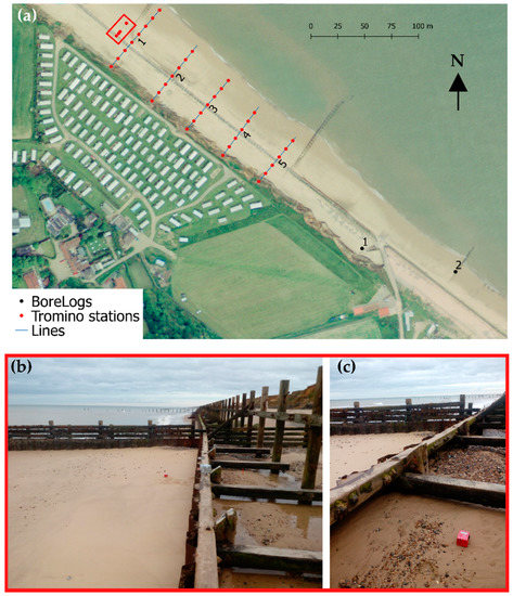 Passive seismic survey recorded locations; (a) 34 points along five lines (i.e., lines 1 to 5) were initially recorded covering the beach from the cliff toe to the seaward limit of the dry beach. Four additional points were recorded during the day, these are shown as points within a red rectangle; (b) detail of the extra station recorded immediately in front of the palisade and; (c) detail of extra station recorded immediately behind the palisade. Beach levels on stations shown in (a,c) were similar within ±10 cm.
