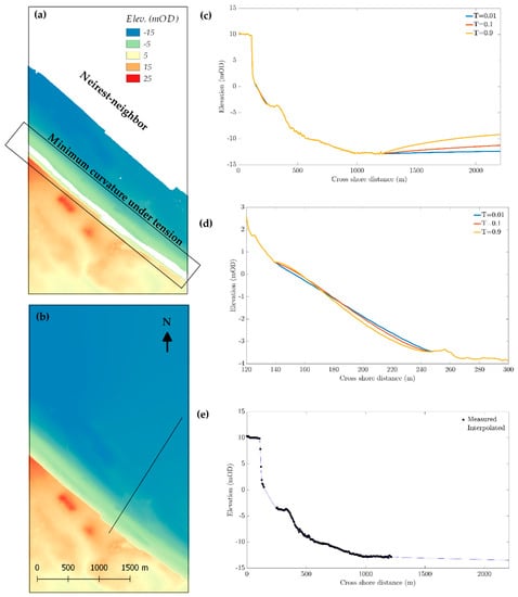 DTM of study site: (a) EA-LIDAR inland topography year 1999 and EA-multibeam bathymetry year 2011 (white areas indicate data gaps); (b) interpolated DTM used in this work; (c) comparison of elevations along the transect shown by a solid black line in (b) using different tension parameter values (i.e., notice the unrealistic depth decrease seawards of ca. 1250 m cross-shore location); (d) detail of the upper shore-face interpolated bathymetries for different tension parameter values; (e) the final interpolated elevation along the same transect.