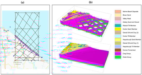 All 29 BGS-held borehole logs within 1.5 km of the study area were assessed for suitability for modelling. Together with the corresponding 1:50,000 scale geological map, a total of 16 boreholes constrain a mesh of 38 manually correlated cross-sections. The coastal cliff section illustration shown in Figure 4 was used as the backdrop to a modelled cross-section along the same route. This was the first cross-section to be correlated and forms the basis of the entire model (Figure 8a).