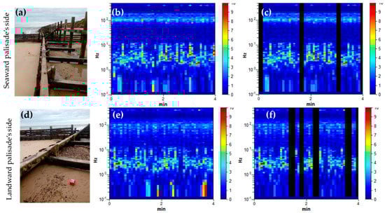 Noise time history recorded and used to calculate the H/V spectra at both sides of the palisade: (a) location of the Tromino at the seaward side of the defence; (b) full record measured at the seaward side; (c) non-used noise data at the seaward side masked with black; (d) location of the Tromino at the landward side of the defence; (e) full record measured at the landward side; (f) non-used noise data at the landward side masked with black;.