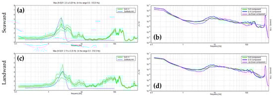 N-S/V spectral ratio, synthetic N-S/V and single component spectra at the seaward and landward side of the palisade; (a) measured (green lines, where thick line is the average and thin lines are the standard deviation) and synthetic (blue line) N-S/V spectral ratio at the seaward side; (b) directional components spectra at the seaward side; (c) measured (green) and synthetic (blue) N-S/V spectral ratio at the landward side; (d) directional components spectra at the landward side.