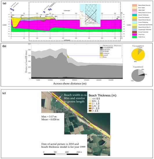 Beach thickness at Happisburgh; (a) lithological model along a cross-section (section location shown as a thicker black line on small region map) showing the cliff and shore platform lithology; (b) combined profile elevation and percentage of different sediment sizes on consolidate and non-consolidated layers across a sub-domain of the lithological cross-section (sub-domain extension is indicated in panel (a) with a dashed rectangle). Total percentages of different sediment fractions shown as pie charts; (c) beach thickness along the Happisburgh coast.