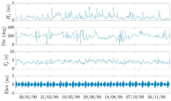 We used the UKCP09 downscaled hindcast data at 2.5 km offshore at 20 m depth to simulate the observed erosion between 1999 and 2000. The coordinates (degrees) of the downscaled wave data are: lat = 52.83 lon = 1.583. The simulation starts on 1 January 1999 00:00:00 with a 1 h time step interval. Tide data recorded at Cromer tide station every 15 min was used to reconstruct a 1 h time step tide time series starting at the same time as the wave time series. Using the harmonic coefficient obtained from the tide series spanning 18 years (1999 to 2017) at Cromer we have reconstructed the tidal elevation time series for 1999. We carried out the harmonic analysis and time series reconstruction using the UTide matlab toolbox [35]. Figure 12 shows the offshore wave forcing (significant wave height, direction and period) and the tide level. The residual elevation (e.g., the difference between the register elevation and the tidal elevation) was also calculated for 1999 (Figure A2) but not used for this simulation. The observed elevation data gap for the Cromer tide series between 17 October 1999 00:30 and 10 November 1999 13:45 was filled assuming that the residuals for this period follows a normal distribution and assuming that the mean and standard deviation are equal to the estimated residuals before filling in the gap (Figure A2).