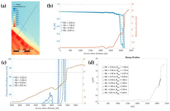CSHORE simulated wave propagation and run up along a representative Happisburgh transect; (a) location of the representative ca. 3.5 km long transect on the DEM of the study site; (b) significant wave height across-shore for different water levels along the representative transect; (c) percentage of waves breaking along the transect (the threshold of 70% used to estimate the surf zone width is represented as a dashed black line); (d) bottom profile elevation and wave run up values for each water level. The coloured circles represent the run up elevation intersection with the bottom profile.