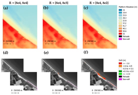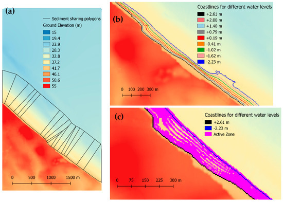 Figure 14 shows how the active zone changes over a tidal cycle for the whole topography. The active zone is simply determined as those cells where the wave to depth breaker ratio threshold, γ, has been reached. Wave height at breaking controls the amount of cliff and platform erosion and the amount of alongshore sediment transport. If the waves are not breaking, there will be neither alongshore sediment transport nor platform erosion, but cliff back wearing could occur if the energy reaching the cliff toe is large enough to induce erosion. At every time step, the coastline is delineated on the DEM and a set of shoreline normal and polygons are created that will be later used to calculate the sediment balances (Figure 14b). We used shoreline normal of 800 m length, which seems long enough (see Figure 13a) to ensure that the waves at the seaward end of the normals are not affected by the bottom whilst not being so long that they reach DEM’s limits. If at least one cell is marked as active within a given polygon, the actual erosion and sediment transport are computed. Bottom change might occur on cells not marked as active if the erosion rates, which depend on the depth to wave height at breaking ratio, are not negligible. Figure 14b shows the cells marked as being in the active zone when the water level raised from −2.23 m to +2.61 m. Notice that, at the maximum water level of +2.61 m, the shoreline reaches the cliff toe (i.e., where ground elevation changes from pale yellow to red) but only at the north end of the embayment. Figure 14c shows the cells marked as active zone for all the simulated water levels zoomed at the north area of the embayment. The width between the most seaward active cells and the most landward active cells is ca. 130 m and ten times larger than the mean surf zone width indicating the importance of tidal levels in affecting the bottom changes.