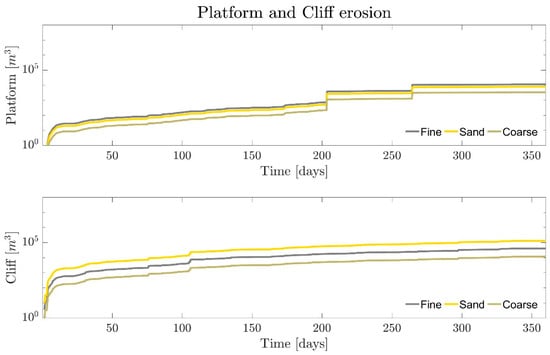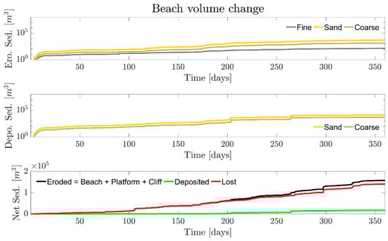 The coarse, sand and fine sediment content are obtained from the 3D thickness model derived from the lithological model of the study area. In addition to differing sediment size fractions, the concept of availability factor represented within CoastalME, since erosion rates are managed separately for the different sediment fractions, in order to capture the interaction between the different sediment size fractions [36]. For each of the three sediment size fractions (coarse, sand and fine) the actual total erosion for each time step is calculated as the minimum of either the stock of sediment available or the product of the availability factor and the total potential erosion (see Equation (7) in [28]). This restriction is applied to ensure that fine sediments are more likely to be eroded, and in larger amounts, than the coarser sediments.