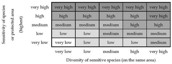This is an approach based on rank assessment values. It doesn’t involve performing arithmetic operations with the values of sensitivity and species diversity, although neither of the two matrix scales is a metric ratio scale (the rational zero and unit of measurement are not defined).