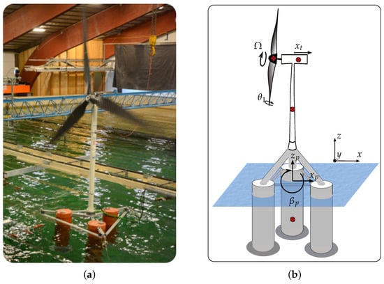 (a) TripleSpar scaled model (1:60), image reproduced from [] with permission from Elsevier, 2018, and (b) mechanical sketch of low-order simulation model of Section 2.4 with generalized coordinates.