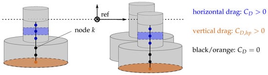 Morison’s original formulation [] was extended for the present work to account, firstly, for the relative fluid velocity due to the body motion and secondly, for heave plates with force components in vertical direction (in the body-fixed frame). The substructure is discretized through nodes as shown in Figure 2. For a flexible model setup, each node k has modified Morison coefficients for all three directions i with the area , projected on direction i in body-fixed coordinates (attention needs to be paid to vertical drag coefficients for heave plates . Here, the drag force is calculated as , whereas, in HydroDyn [], it is assumed that for each heave plate a node is defined for both ends and half the drag force applies to each end).