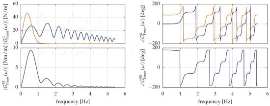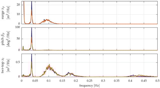 A mechanical sketch of the low-order coupled simulation model, which is used in this work, was shown in Figure 1. The model has been developed with the focus of a computationally efficient representation of the overall dynamics of the FOWT for control design and an overview on critical load situations. It was used in comparable configurations in previous works [,,,]. Its derivation starts with physical (as opposed to black-box) models, keeping the basic nonlinearities. In a next step, the nonlinear models are linearized. A frequency-domain computation of the response spectra will be used in the present work. The model will be called Simplified Low-OrderWind Turbine (SLOW) in the following.