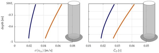 Figure 4 (left) shows the velocity STD over the 1:60 scaled TripleSpar columns of [] for two sea states. The body velocity depends on the depth, in a way determined by the inherent wave response properties of the floater. The drag coefficient, Figure 4 (right), calculated with Equation (4), depends in the same way on the body velocity. The linearized nodal drag force for the upper node at SWL for one column is shown in Figure 5, together with the nonlinear drag force resulting from the nodal velocity . The figure shows for the same two environmental conditions as Figure 4. The linearization depends clearly on the response magnitude (STD, marked by dashed lines).