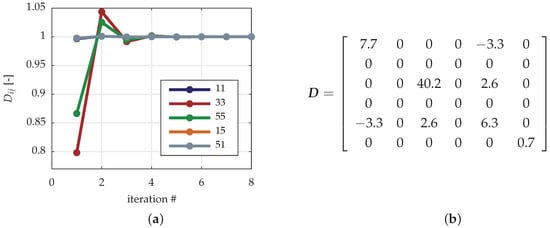 (a) iterative solution of Morison drag coefficient matrix D for all relevant indices for aligned wind and waves (scaled model of [], LC 7) and (b) obtained generalized damping matrix.