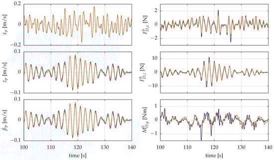 In this section, the drag coefficients of Equation (3), related to the damping , will be identified. The damping is part of the system properties: in a unified state-space description of the FOWT, it is part of the system matrix (A) and influences the eigendynamics. These eigendynamics are especially important for the prediction of the system stability and for the controller design, as mentioned in the Introduction. Consequently, this coupling should be taken into account when determining the drag. To do this, an iteration is necessary: the hydrodynamic damping is updated as a function of the entire system response of the coupled model, until the calculation converges.