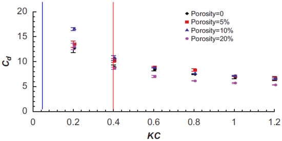 Vertical drag coefficient for heave plates of different porosities (only 0-porosity relevant) with vertical lines for Keulegan–Carpenter (KC) values corresponding to LC 7 (blue) and LC 9 (red) of []. Adapted from ([], p. 1012) with permission from Elsevier, 2018.