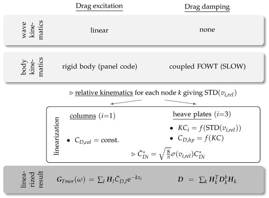 A linearized description of the drag is necessary for the iterative frequency-domain solution. Morison’s drag term, Equation (1), contains both damping and excitation forces due to the relative velocity between the undisturbed fluid and the body. The next sections address first the method to obtain the linearized drag coefficients. Thereafter, both the calculation of the excitation part through a transfer function from the wave height to the nodal forces follows as well as the nodal damping of the FOWT platform will be addressed.