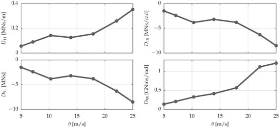 The iteration was performed with the simulation model of Section 2.4. The computation was done for a representative load case at above rated winds of Table 2 with the full-scale TripleSpar concept. The resulting generalized damping matrix D over the wind speed bins is shown in Figure 10. A clear dependence of the linearized damping on the environmental bins is observable. It is noted that the wind speeds are correlated with higher sea-states.