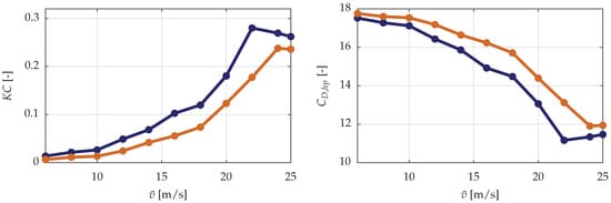 Figure 11 shows KC as well as the heave plate drag over all operational wind speeds. Both drag coefficients are shown, the one of the damping problem (blue) and the one of the excitation problem (orange). It can be seen that their qualitative shape is equal, although differences occur for the higher sea-states (see Table 2). The origin of the peak at m/s was analyzed. It is not caused by the interaction with the controller. Therefore, it is a result of the system property sensitivities with respect to the operating point and the wind and wave conditions of Table 2. The drag coefficient for the heave plates varies in the shown load conditions significantly in the range . In the Offshore Code Comparison Collaboration, Continued (OC4) code comparison project [], a value of was used for all simulations.