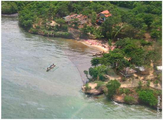Oil stranded on the shoreline adjacent to a fishing farm. Reproduced from [4], with permission from ITOPF, 2018.