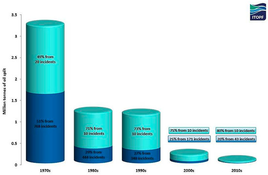 Oil spills per decade (1970s–2010s), of over 7 tn, showing the influence of a relatively small number of comparatively large spills on the overall figure. Reproduced from [5], with permission from ITOPF, 2018.