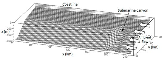 This study employs the three-dimensional COHERENS model [10], which is based on terrain-following sigma coordinates. The model settings used are similar to those of previous studies [5,11]. The model domain (Figure 1) is 240 km in length and 120 km in width resolved by a horizontal grid spacing of 1 km and 20 vertical sigma levels. The idealized continental margin consists of a straight coastline, a continental shelf, a continental slope, and a single shelf-break canyon.