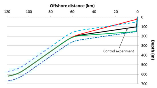 The continental shelf of the control experiment has a width of 60 km and a depth ranging from 100 m at the coast to 200 m at the shelf-break. The associated angle is 0.1° corresponding to an inclination of s = 0.0017 or 1.7 m/km. The continental slope has an angle of 0.46° (inclination is 8 m/km). Maximum water depth is cut off at 600 m to maximize model efficiency. Variations of this cut-off depth had no noticeable impact on the results (not shown). It should be noted that the deepest portions of the continental slope are smoothed such that the seafloor is plane along the open offshore boundary.