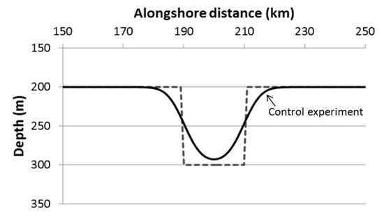 Variations of canyon shapes discussed in this paper. Shown are bathymetric transects along the shelf break at y = 60 km. The solid line represents the configuration of the control experiment. The dashed line denotes a box-type canyon considered in sensitivity studies.