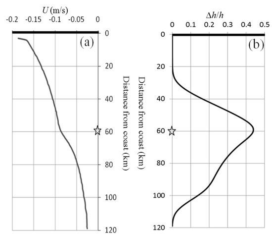 Control experiment: (a) offshore structure of ambient along-shore geostrophic flow; and (b) maximum possible water-column stretching Δh/h (Δh, canyon depth; h, ambient total water depth). The star indicates the location of the shelf break.