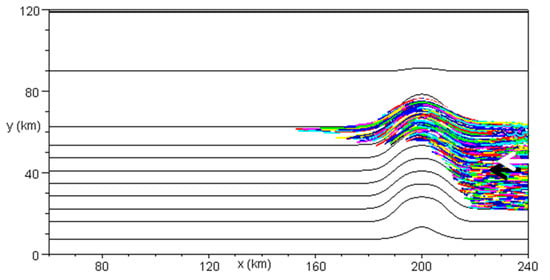 Topographic steering scenario. Trajectories of 3000 passive near-bottom drifters from day 5 to day 25 of the simulation. Black lines are isobaths. The arrow denotes the flow direction.