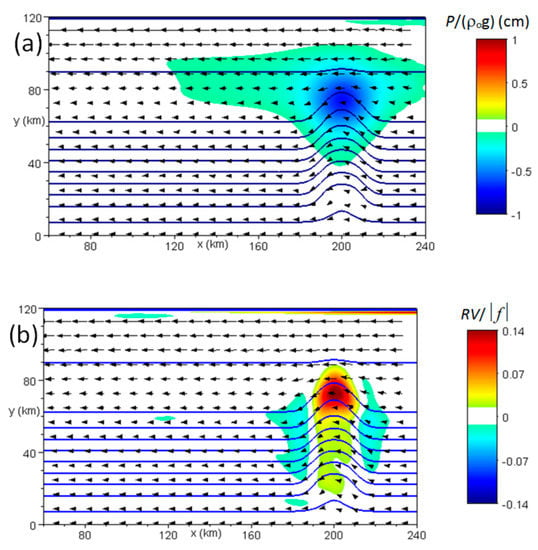 Right-bounded flow in the northern hemisphere is smoothly topographically steered across the shelf-break canyon (Figure 5). Note that the same applies to left-bounded flow in the southern hemisphere. Here, flow disturbances were created in interaction with the canyon and were carried downstream via topographic Rossby waves propagating into the same direction as the ambient flow. Flow–canyon interaction led to establishment of a low-pressure anomaly centered over the canyon head in which the sea level was lowered by ~0.8 cm (Figure 6a). Indeed, such small sea-level anomalies cannot be detected by satellite altimetry. In turn, this low-pressure anomaly created a quasi-geostrophic flow field of positive relative vorticity (∂v/∂x − ∂u/∂y > 0) (Figure 6b). The exclusion of density and frictional effects yielded identical results (not shown). Hence, flow disturbances created through interaction with the canyon obeyed the principle of conservation of potential vorticity along the streamlines of the barotropic flow; that is,