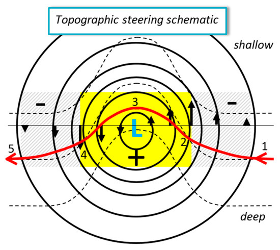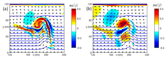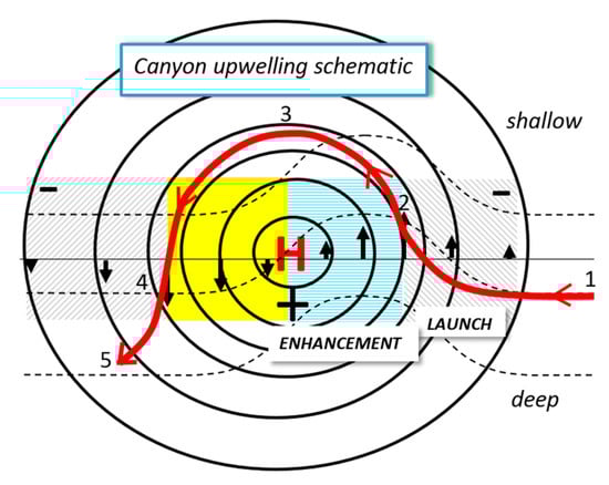 The canyon–flow interaction process created a relatively complex relative-vorticity field (Figure 10), which is discussed in the following. Figure 11 shows a schematic of this process, which can be classified as a failure of topographic steering.