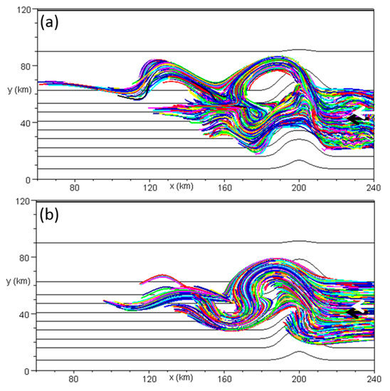 Canyon-upwelling scenario based on trajectories of 3000 passive near-bottom drifters from day 5 to day 25 of the simulation: (a) the result for the full model configuration; and (b) the result for a model run with uniform seawater density and zero friction. Black lines are isobaths. Arrows indicate the overall flow direction.