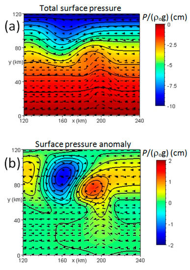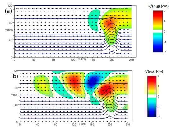 Flow–canyon interaction leads to the establishment of a high-pressure anomaly near the canyon head (Figure 9a), noting that the topographic steering scenario resulted in a low-pressure anomaly (see Figure 6a). More importantly, and in contrast to the latter scenario, the center of this pressure anomaly establishes slightly downstream from the canyon axis. Again, pressure anomalies are most pronounced near the canyon head, where the possible degree of water-column stretching is at maximum (see Figure 4b). Here, pressure anomalies correspond to a sea-level elevation of ~1.5 cm. In contrast to the topographic steering case, alternating high and low pressure zones develop downstream from the canyon on the continental shelf (Figure 9b). This pressure pattern is the signature of a stationary wave of a wavelength of ~90 km.