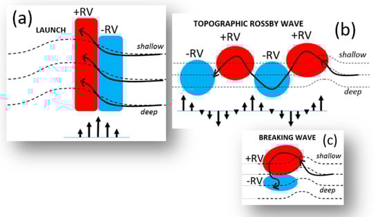 Schematics of different phases of the canyon-upwelling process: (a) the launch phase (Phases 1 → 2 in Figure 11); (b) the initiation of a topographic Rossby wave in the lee of the canyon; and (c) the possibility of breaking waves. Dashed lines are bathymetric contours. Long arrows indicate flow trajectories. Colored regions indicate zones of positive or negative relative vorticity (RV). Small arrows denote the structure of the cross-shelf flow. See text for further discussion.