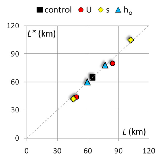 Canyon-upwelling scenario. Comparison between theoretical (L) and simulated wavelengths (L*) of pressure anomalies developing on the continental shelf in the lee of the shelf-break canyon.