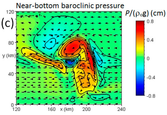 Overall, there appear to be three different pressure and length scales involved in the process. First, the ambient barotropic geostrophic flow is characterized by a pressure equivalent of ~10 cm in sea surface elevation over the width of the shelf (~60 km) (Figure 14a). Second, the stationary topographic Rossby waves is characterized by a pressure equivalent of ~2 cm in sea surface elevation over the wavelength of this wave (~60 km) (Figure 14b). Third, baroclinic near-bottom jets are characterized by a pressure equivalent of <1 cm on frontal widths of ~1 km (Figure 14c).